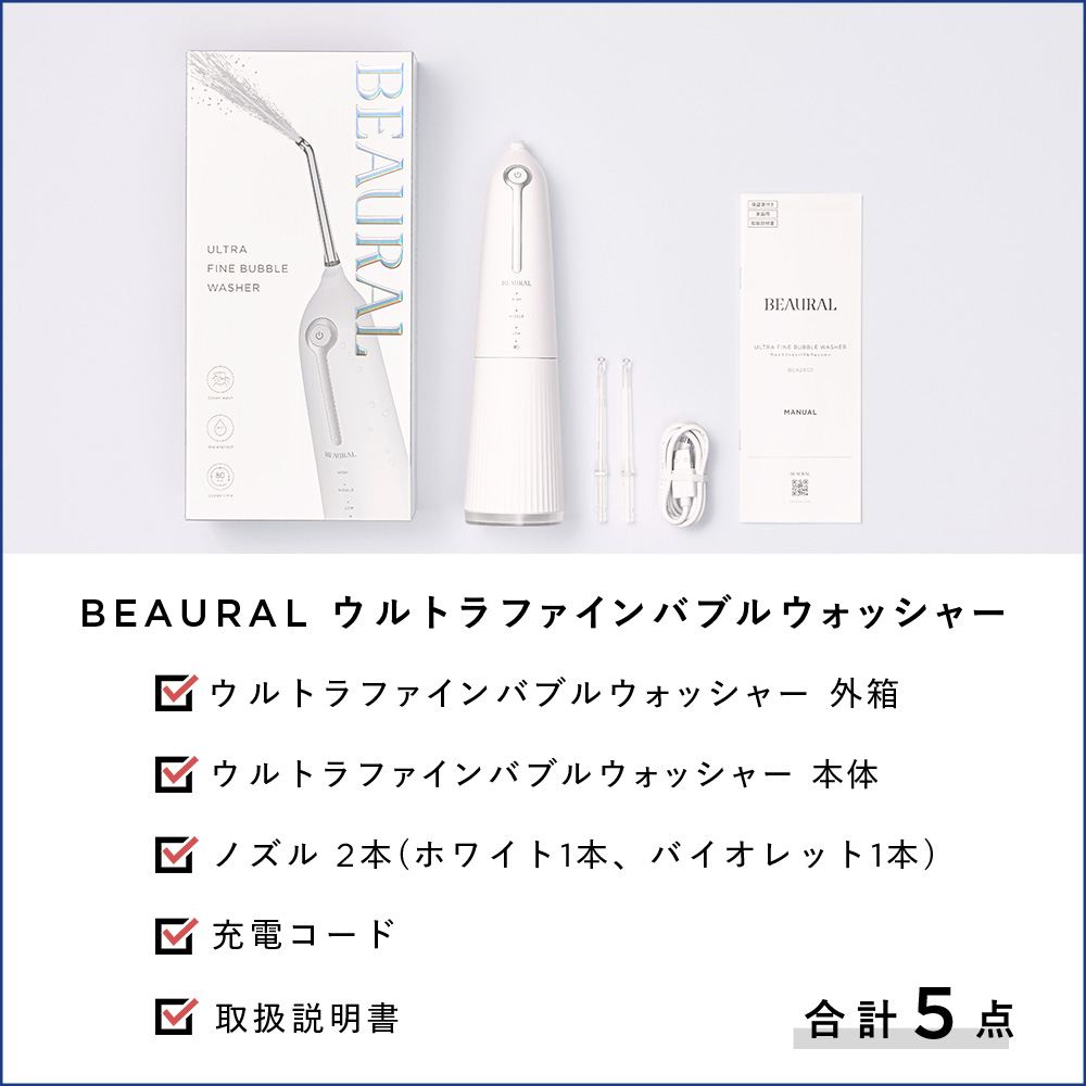 ※ファインバブルウォッシャー外箱、ファインバブルウォッシャー商品本体、ノズル2本(ホワイト1本、バイオレット1本)、充電用ケーブル、取扱説明書(保証書付き)1冊